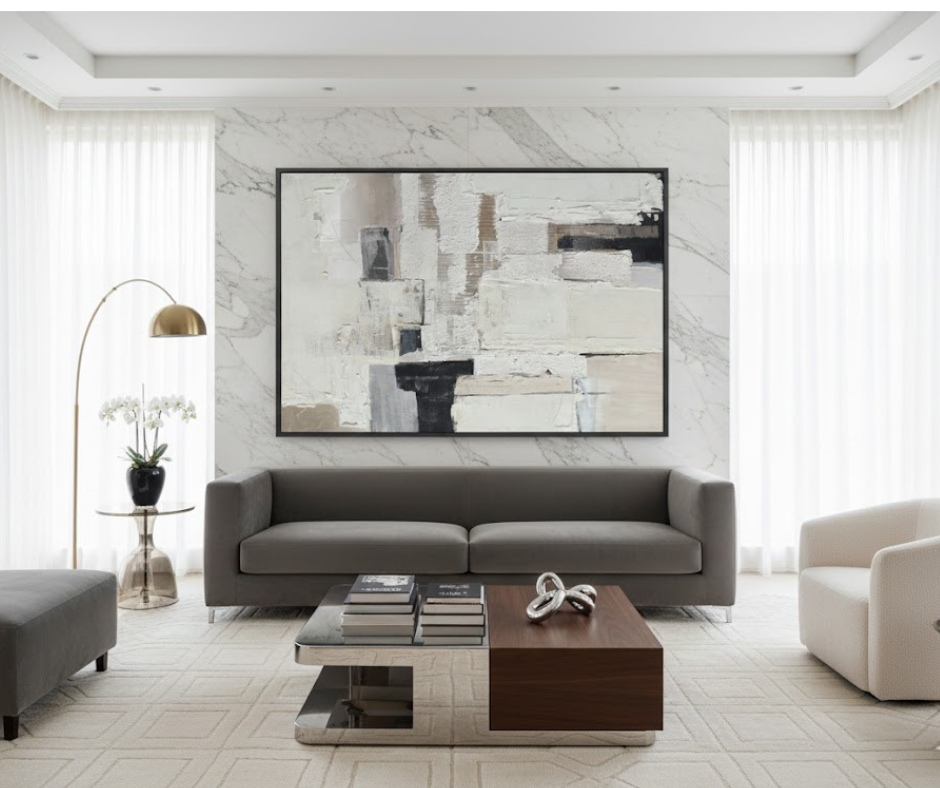 Large 40x60 inch horizontal abstract painting titled Onyx & Bone. Features a complex arrangement of heavy textured blocks in cream, beige, grey, and deep black.