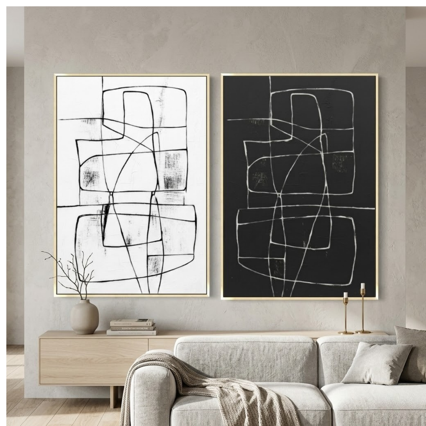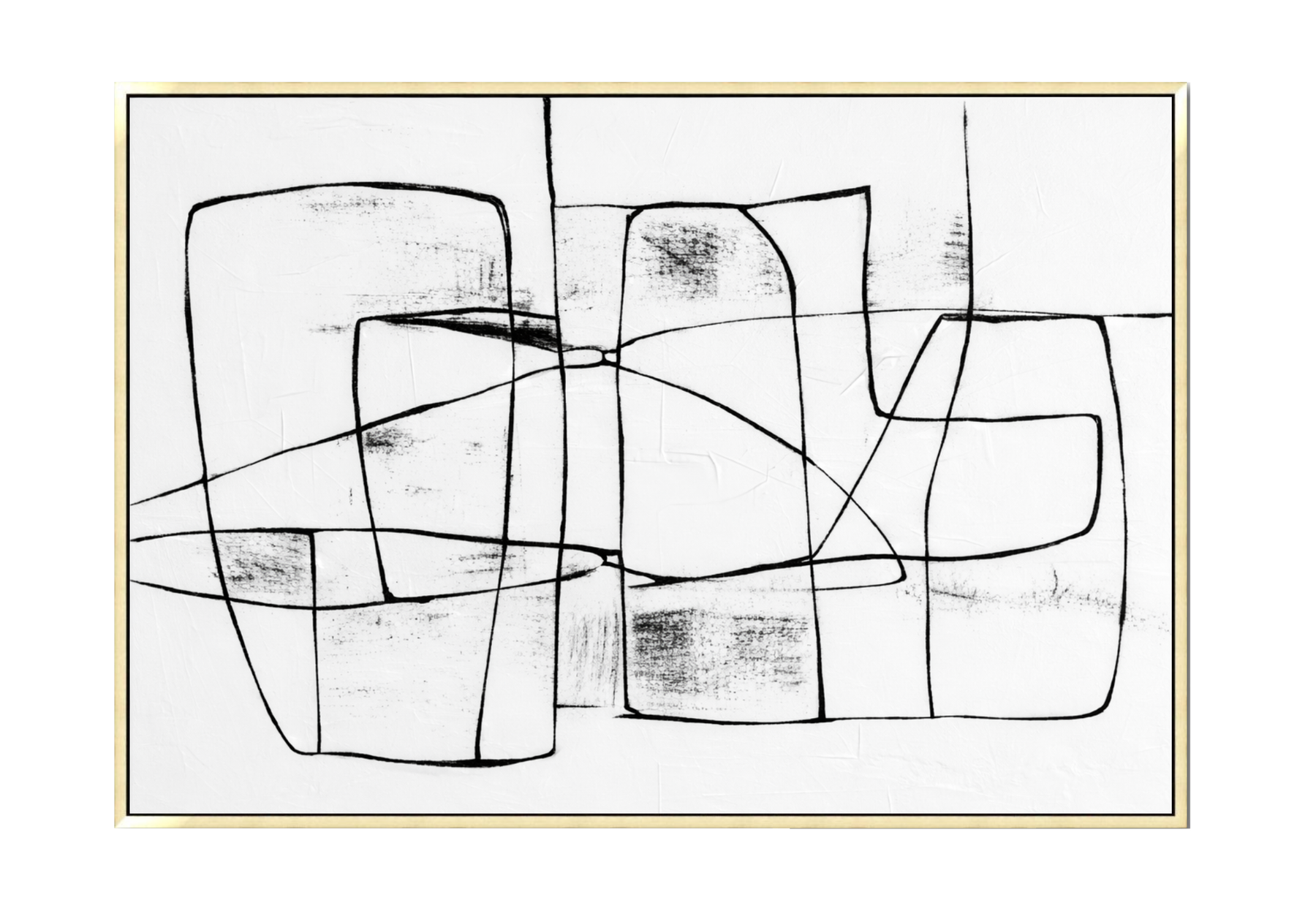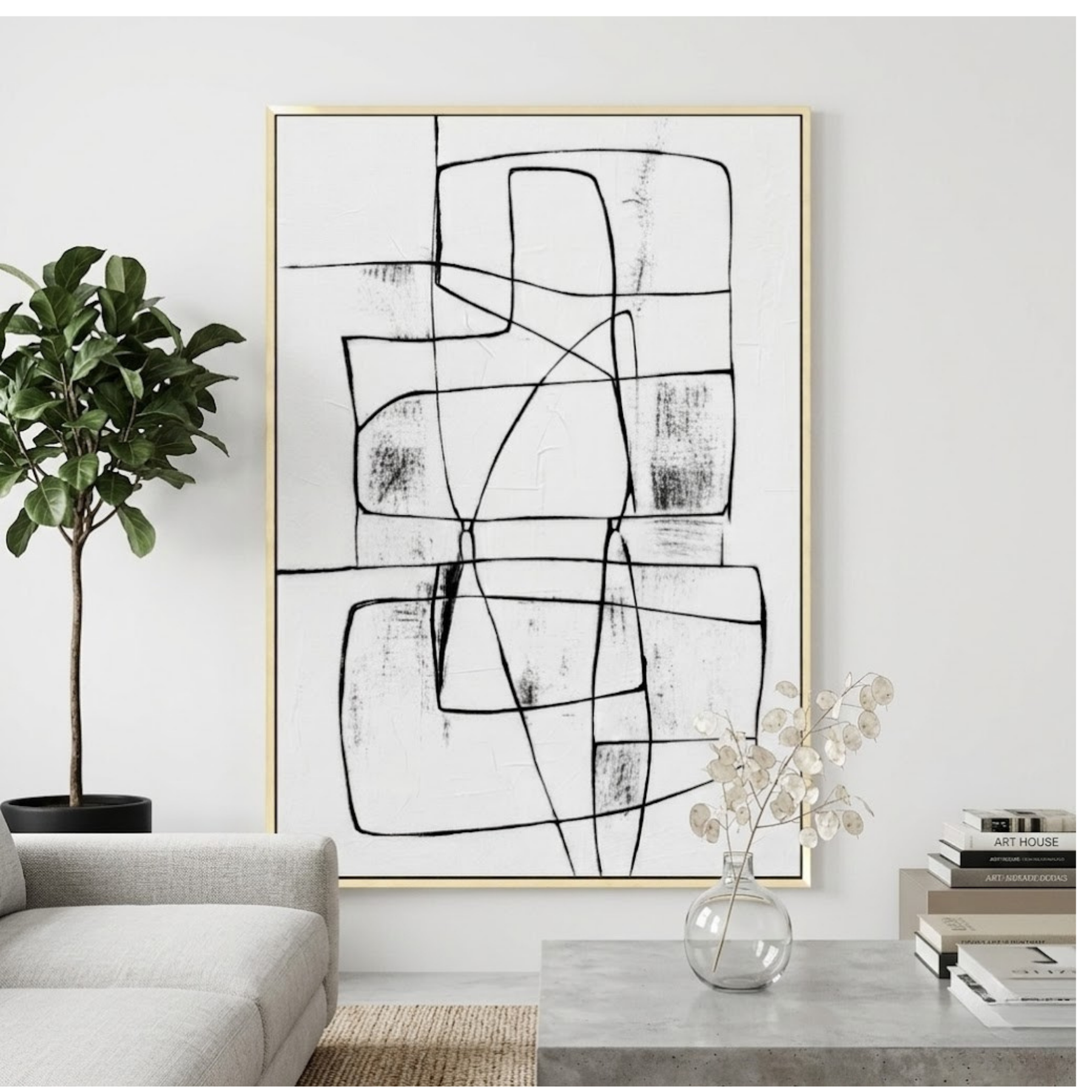 Tangle IIĀ is a refined, hand-painted abstract canvas that anchors a room with its modern simplicity and graphic precision. The expansive 40x60 composition features a sophisticated web of intersecting black lines that create an elegant, airy structure across a pristine white ground. With its clean aesthetic and subtle textural depth, this monochromatic statement piece is an ideal focal point for Modern Minimalist, Scandinavian, or Executive office interiors.