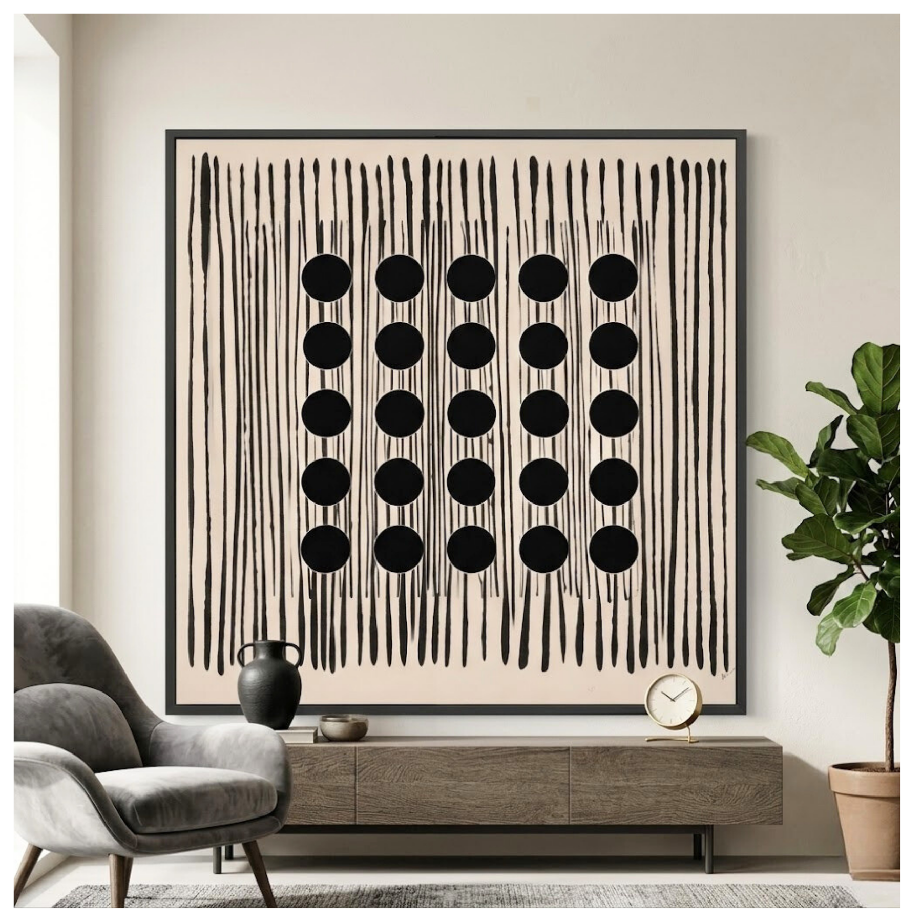 Matrix is a sophisticated exploration of order, rhythm, and celestial geometry. Occupying a commanding 60x60 square format, this piece features a perfectly aligned 5-by-5 grid of solid black spheres that appear to float over a vibrating field of thin, hand-painted vertical lines. The stark contrast between the bold, circular forms and the delicate, linear backdrop creates a mesmerizing "matrix" effect that draws the eye into its balanced center. Equal parts mathematical and mystical, this oversized statement piece is designed for High-End Minimalist, Modern Executive, or Architectural interiors where scale and precision are paramount.