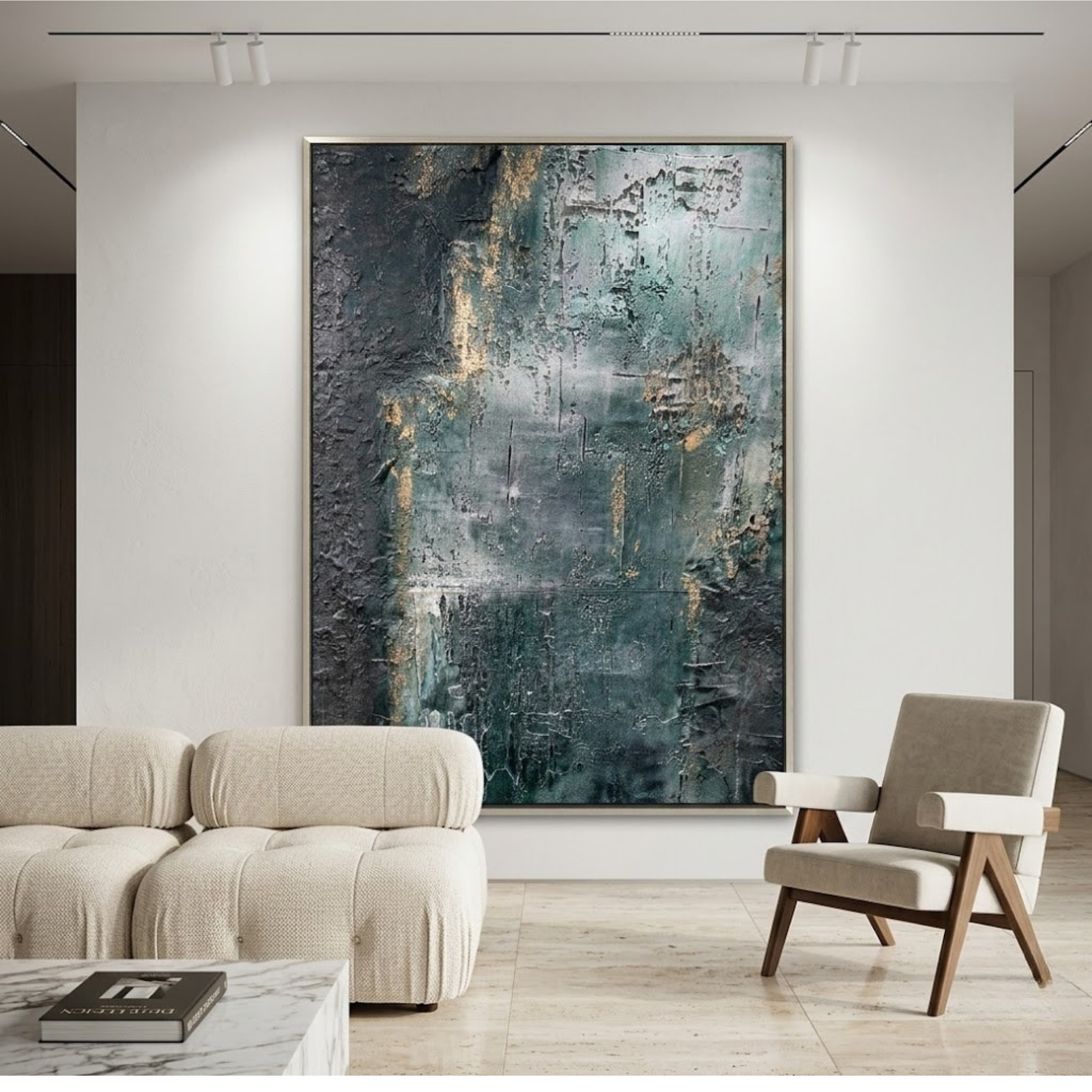 Jade Crust is a moody and opulent hand-painted abstract canvas that explores the intersection of mineral beauty and geological decay. This expansive 48x72 composition is anchored by deep, saturated emerald and forest greens, layered with shimmering patches of weathered gold leaf. The surface is defined by a striking, high-relief crackle texture in charcoal and jet black, mimicking the look of ancient stone or a precious vein of ore unearthed. This sophisticated statement piece brings a sense of dark, organic luxury to Moody Maximalist, Contemporary Luxe, or Executive interiors.