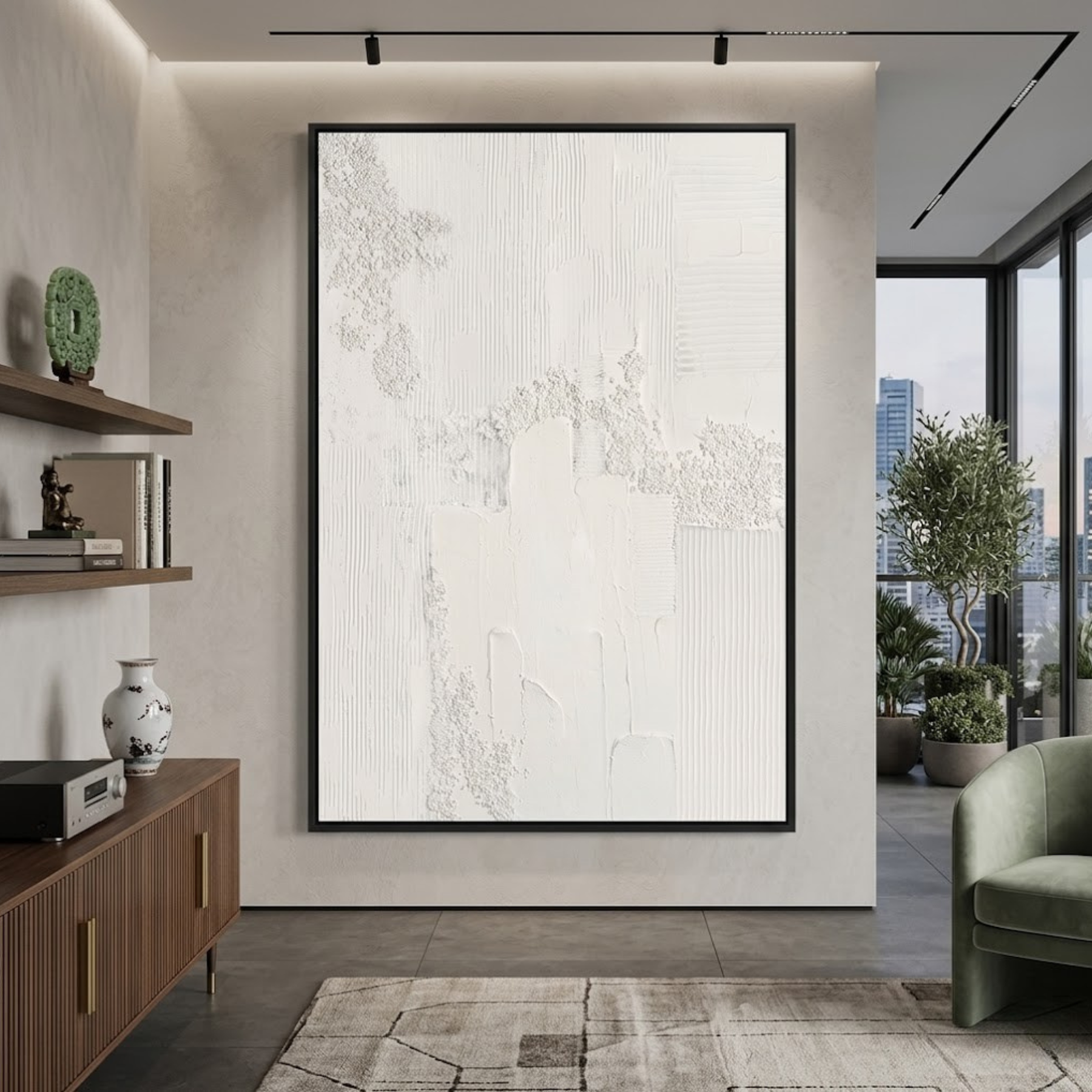 Silent Texture is a profound exploration of minimalism where the absence of color amplifies the presence of form. This expansive 48x72 hand-painted canvas relies entirely on light and shadow to reveal its complex, architectural surface. The composition is a curated map of physical relief—featuring rhythmic, raked grooves that suggest mechanical order, contrasted by organic, pumice-like clusters and smooth, liquid gesso "pours." By stripping the work down to pure Alabaster and Bone white, the piece becomes a living element of the room, shifting in character as the sun moves across the space. A quintessential statement for High-End Minimalist, Wabi-Sabi, or Contemporary Gallery interiors.