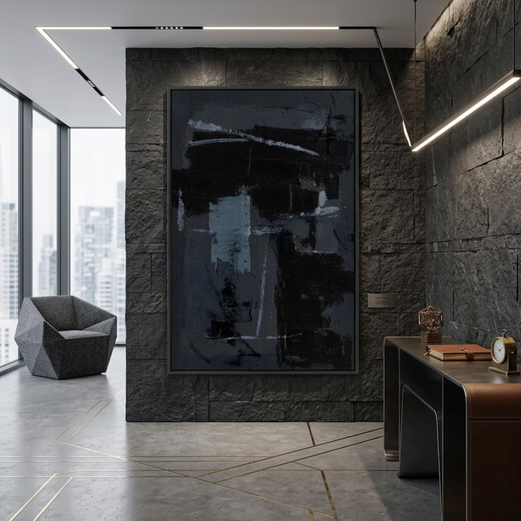 Asphalt Rain captures the gritty, electric atmosphere of a city at night. This expansive 48x72 hand-painted canvas is a deep dive into nocturnal tonality, utilizing layers of charcoal, soot-grey, and obsidian black to create a dense, industrial surface. The composition is brought to life by vertical, liquid-like "pours" that mimic the streaking of rain against a metropolitan window, while sharp, crystalline highlights of icy blue and silver provide a stark, cooling contrast. Gritty, physical texture and scumbled brushwork give the piece a weathered, urban soul. An ideal statement for Modern Industrial, Dark Luxe, or Moody Transitional spaces.