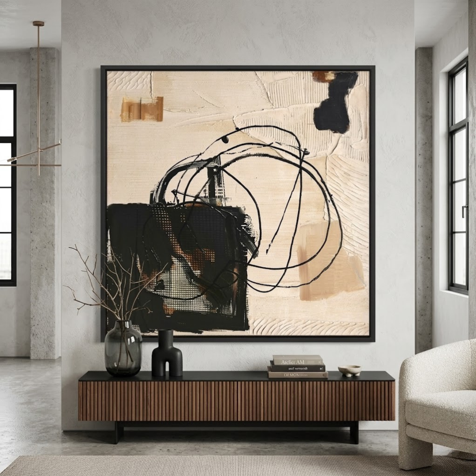 Scribbled Core is an evocative study of energy and restraint, presented on a massive 60x60 square canvas. The piece is anchored by a dense, charcoal-black heart of gestural paint, from which a series of delicate, sweeping "scribbles" and rhythmic loops emerge. These wire-like lines suggest a frantic yet graceful movement, caught in a moment of stillness. The backdrop is a rich, tactile field of warm cream and parchment tones, built up with heavy impasto to provide a stone-like counterpoint to the fluid black ink-work. This piece is a perfect focal point for Modern Minimalist, Contemporary Art Gallery, or Industrial Chic spaces that value bold, expressive mark-making.