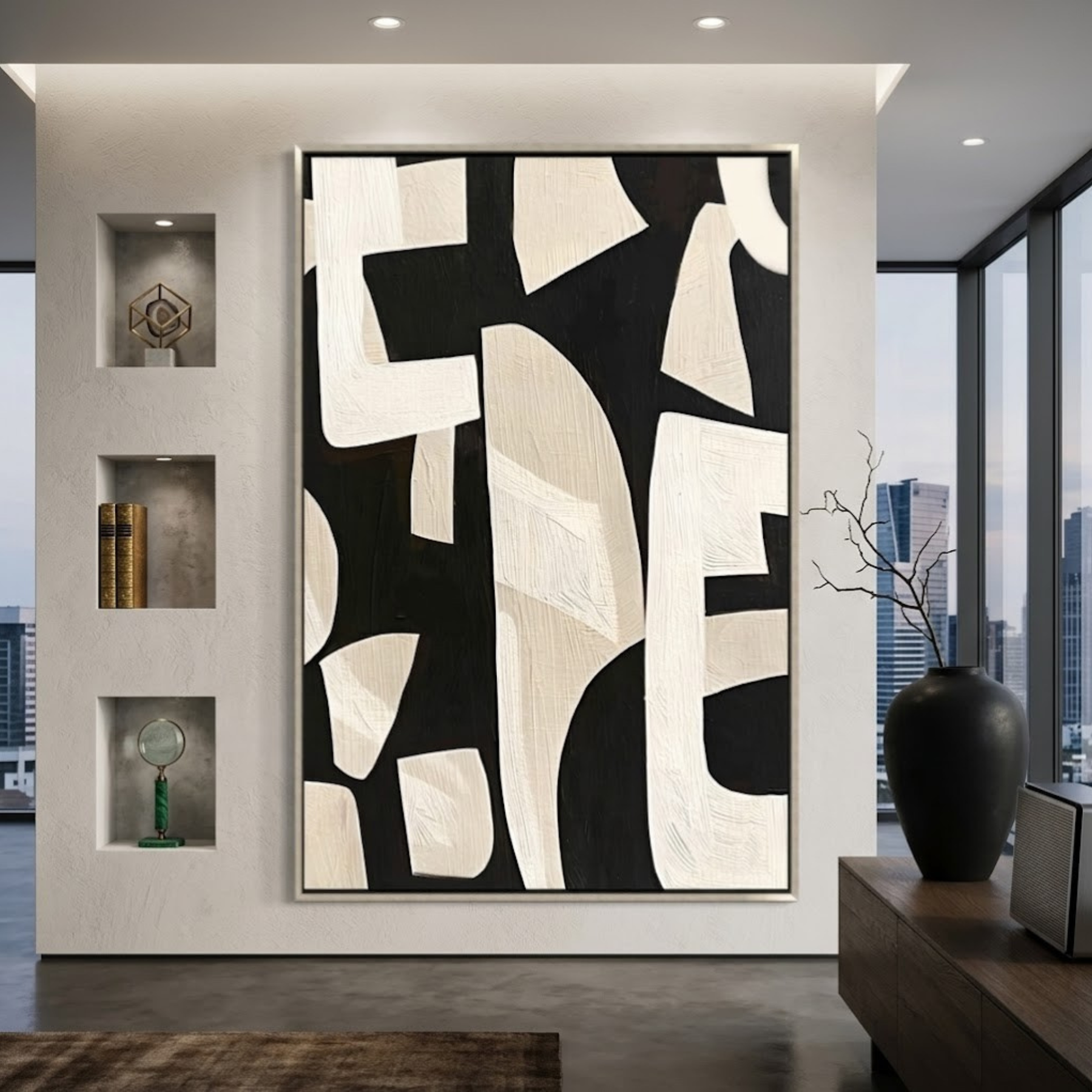 Basalt Grid is a celebration of architectural permanence and geometric rhythm. This commanding 48x72 hand-painted canvas presents a structural "grid" of interlocking rectangular forms, evocative of basalt columns or a metropolitan skyline. The palette is strictly high-contrast, utilizing deep charcoal-black and luminous off-white. The true power of the piece lies in its heavy impasto application—each block is built up with a palette knife to create physical height and sharp, chiseled edges. This sculptural relief interacts dynamically with shadows, making it a perfect anchor for Brutalist, High-End Modern, or Minimalist design schemes.