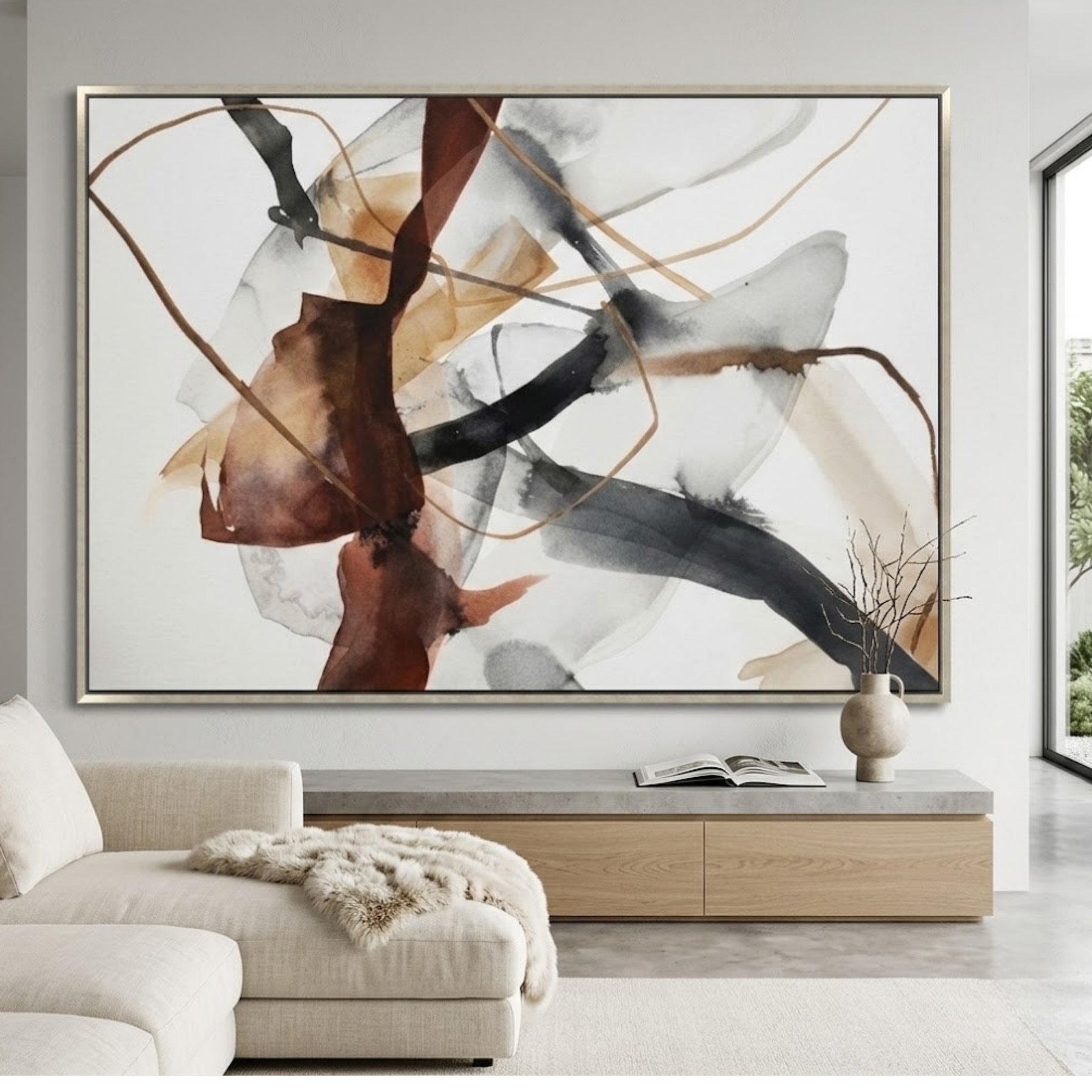 Crimson Vapor is an ethereal, hand-painted abstract canvas that captures the fluid, fleeting beauty of atmospheric movement. The expansive 48x72 composition is defined by translucent layers of smoke grey and warm crimson that bleed into deep mahogany accents. Topped with delicate, shimmering gold gestural linework, the piece suggests a landscape seen through mist or the swirling patterns of rising heat. This sophisticated statement piece brings a sense of calm, organic elegance with a bold infusion of color to Modern, Transitional, or Contemporary Luxe interiors.
