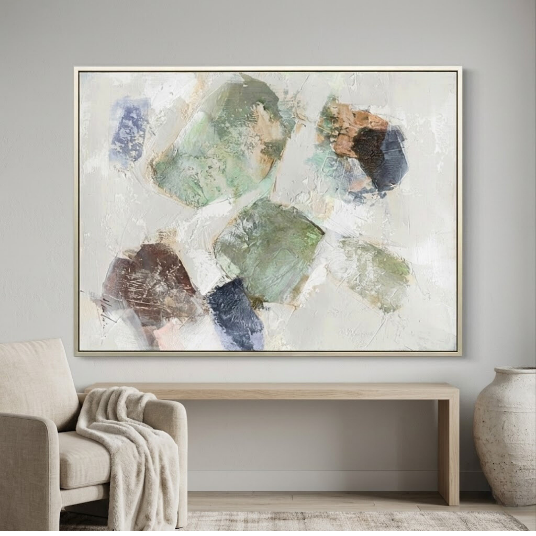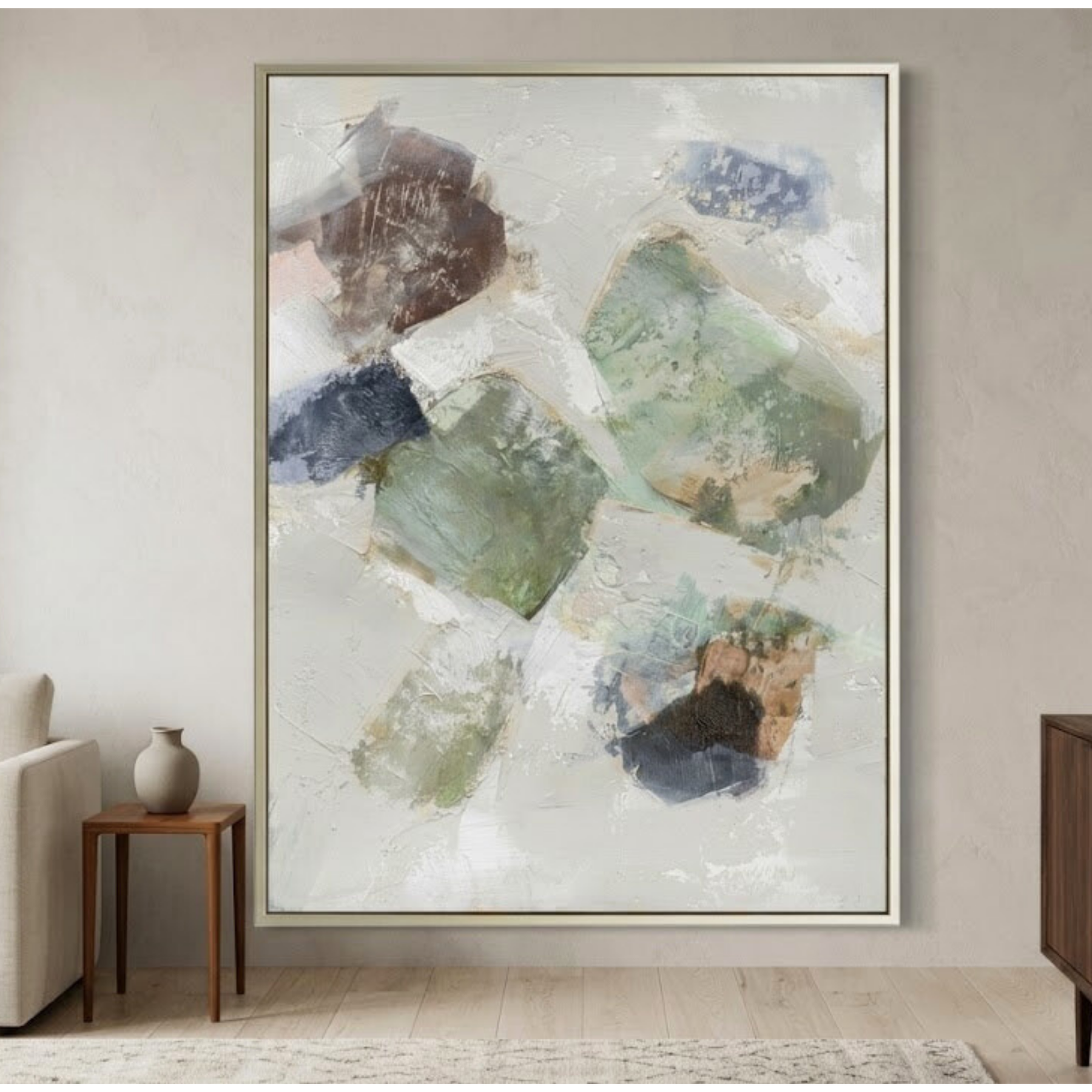 Mossy Strata is a grounded, hand-painted abstract canvas that draws inspiration from the layered textures of the natural world. This 36x48 composition features a sophisticated arrangement of organic, floating forms in a rich palette of moss green, deep navy, and earthy sienna. Set against a distressed, multi-layered neutral ground, the artwork balances bold color blocks with subtle, weathered details. This piece brings a sense of forest-inspired calm and modern structure to Organic Modern, Transitional, or Eclectic interior spaces.