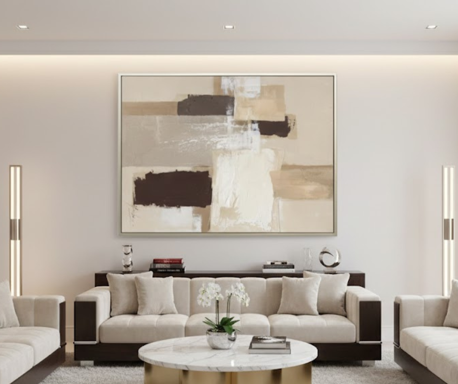Tilted Earth is a grounded, hand-painted abstract canvas that anchors a room with its architectural balance and warm, organic palette. The composition features a sophisticated arrangement of overlapping rectangular forms, where deep chocolate brown and crisp cream blocks create a striking contrast against a layered beige ground. Using a refined palette knife technique, this piece offers subtle textural depth and a sense of structural stillness, making it a perfect addition to mid-century modern, transitional, or high-end office interiors.