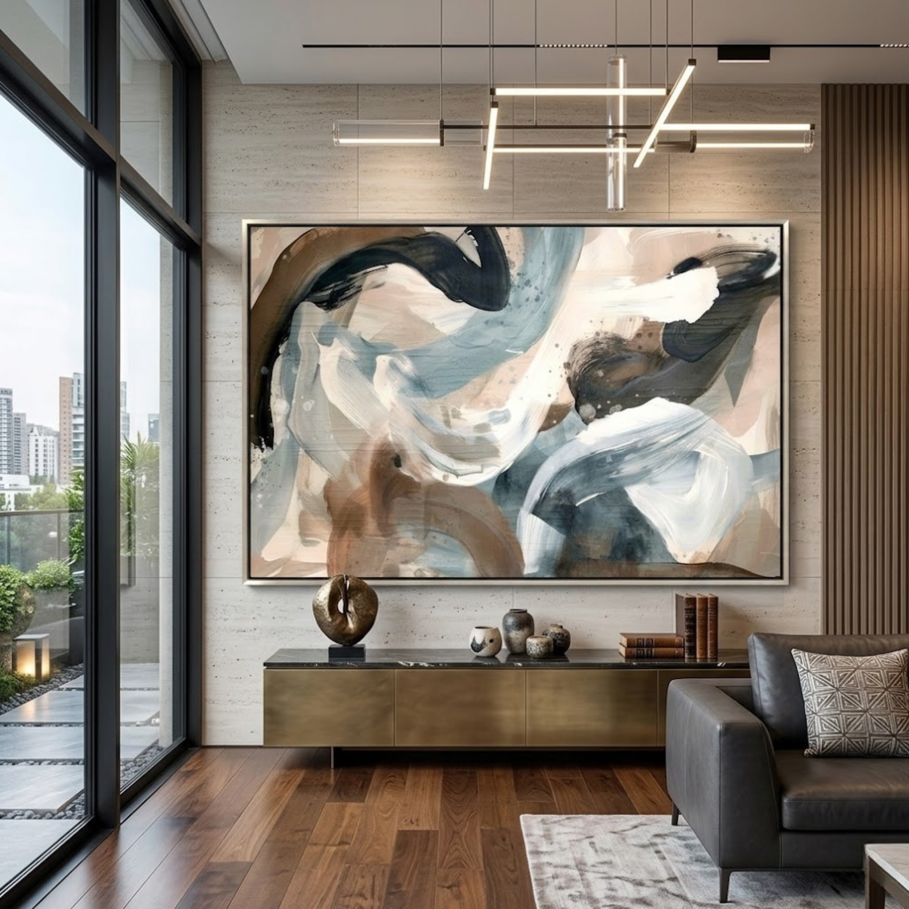 Painted Wind is a breathtaking study of movement and atmospheric light. This expansive 48x72 hand-painted canvas captures the invisible grace of a gust of air, rendered through sweeping, translucent arcs of glacial blue and shimmering silver-grey. Beneath these cool, kinetic strokes lie grounded washes of warm earth tones, creating a beautiful temperature balance. The composition is finished with fine, delicate splatters that suggest sea spray or mist caught in a breeze. With its airy palette and elegant momentum, "Painted Wind" brings a sense of fresh, expansive energy to Coastal Modern, Soft Contemporary, or Spa-Inspired residential spaces.